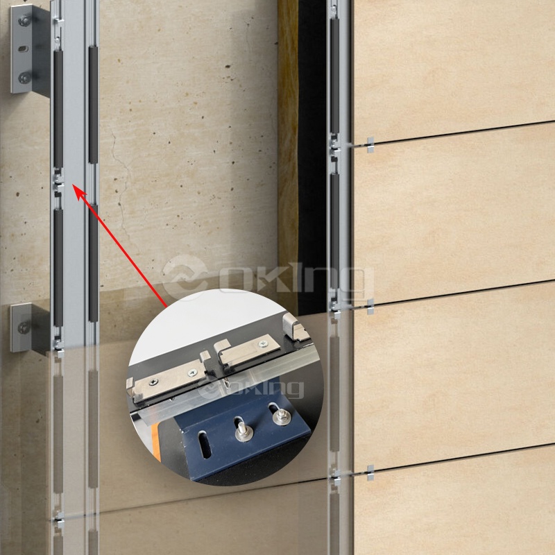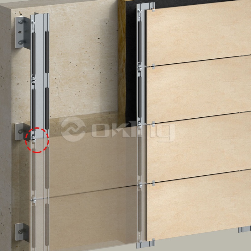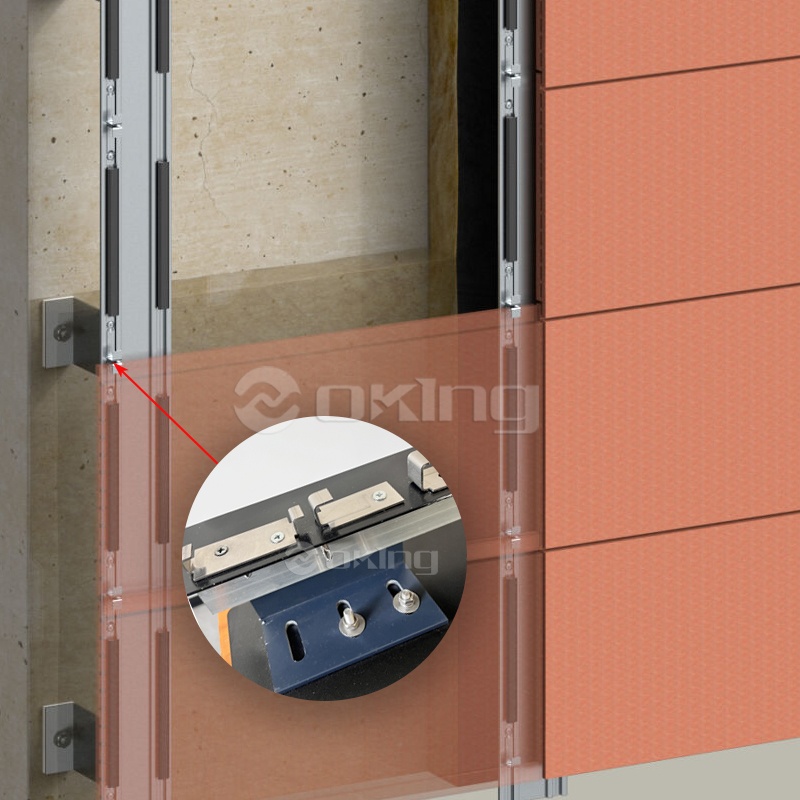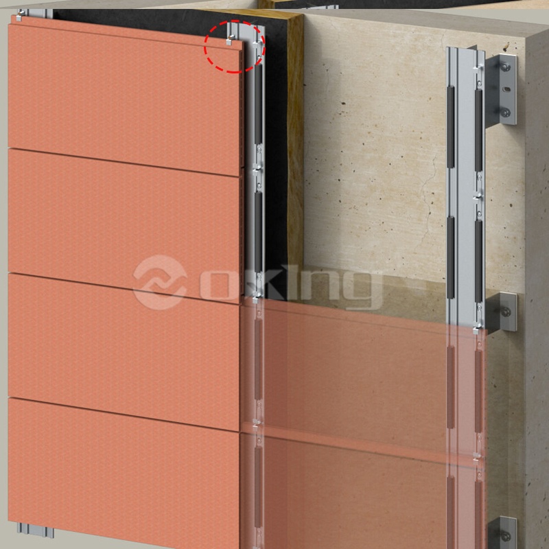 Spezialisiertes Befestigungssystem für Fassadenplatten: kompatibel sowohl mit der verdeckten Installierenation von Terrakottaplatten als auch mit der sichtbaren Befestigung von Keramikplatten. Ausgestattet mit mehreren Variantenoptionen für unterschiedliche Anwendungsanforderungen verfügt es über sichtbare Kantenklemmen für die freiliegende Befestigung dünner Fassadenplatten (z. B. Keramik) und integrierte Kantenklemmen für die verdeckte Befestigung von Terrakottaplatten und sorgt so für stabile und maßgeschneiderte Befestigungseffekte.
