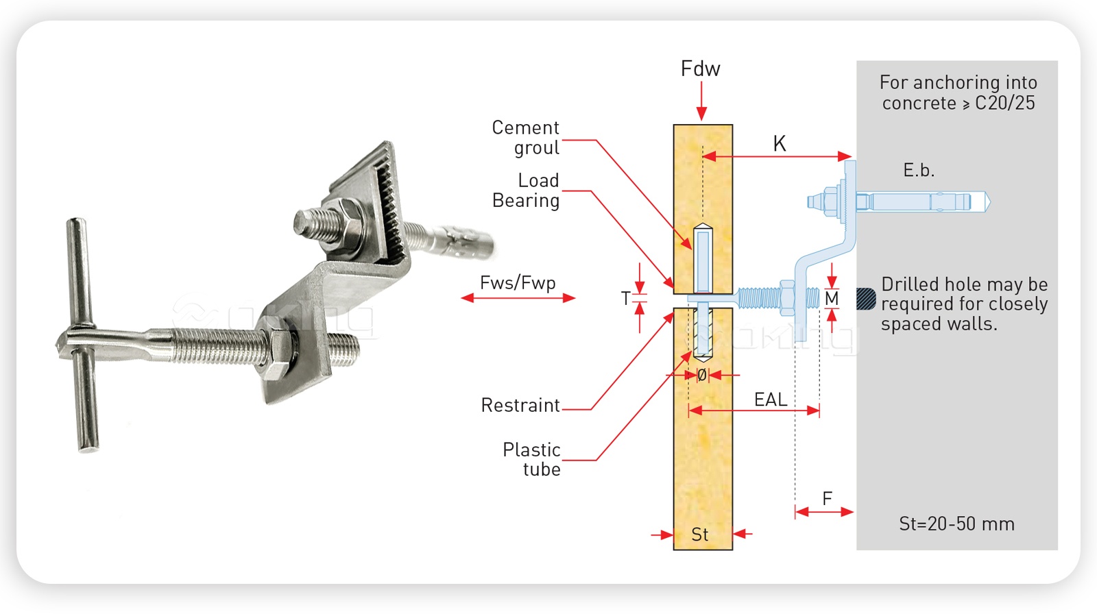 | K (mm) | K - (mm) | K (mm) | Fdw (N) | F (mm) | Fwp (N) | Fws (N) | E.b.(mm) | ф (mm) | M (mm) | T (mm) | EAL(mm) | |